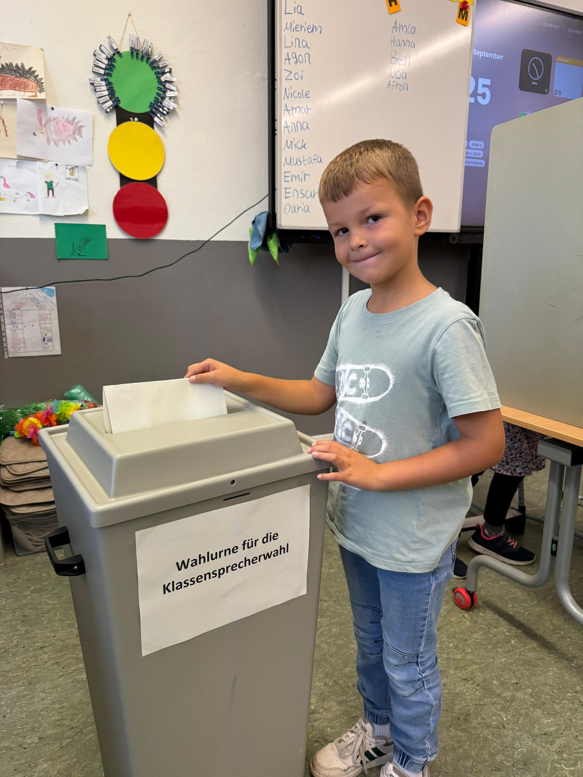 Im Vorfeld konnten die Kandidaten Wahlplakate für sich erstellen und sich den Kindern der Klasse vorstellen und einen kleinen "Wahlkampf" für sich führen. Dies war eine großartige Erfahrung für die Kinder und ein toller Schritt auf dem Weg zum Demokratie-Lernen.
