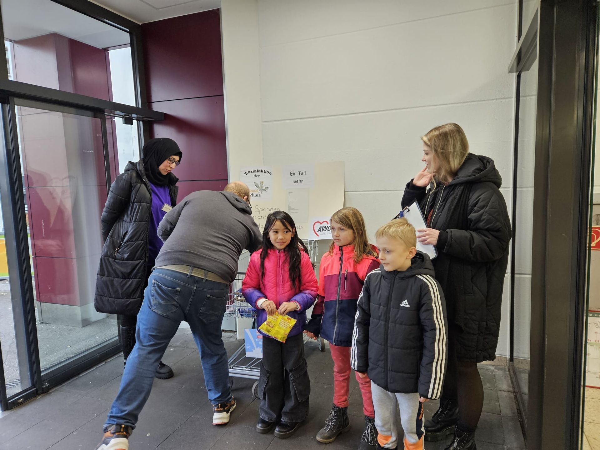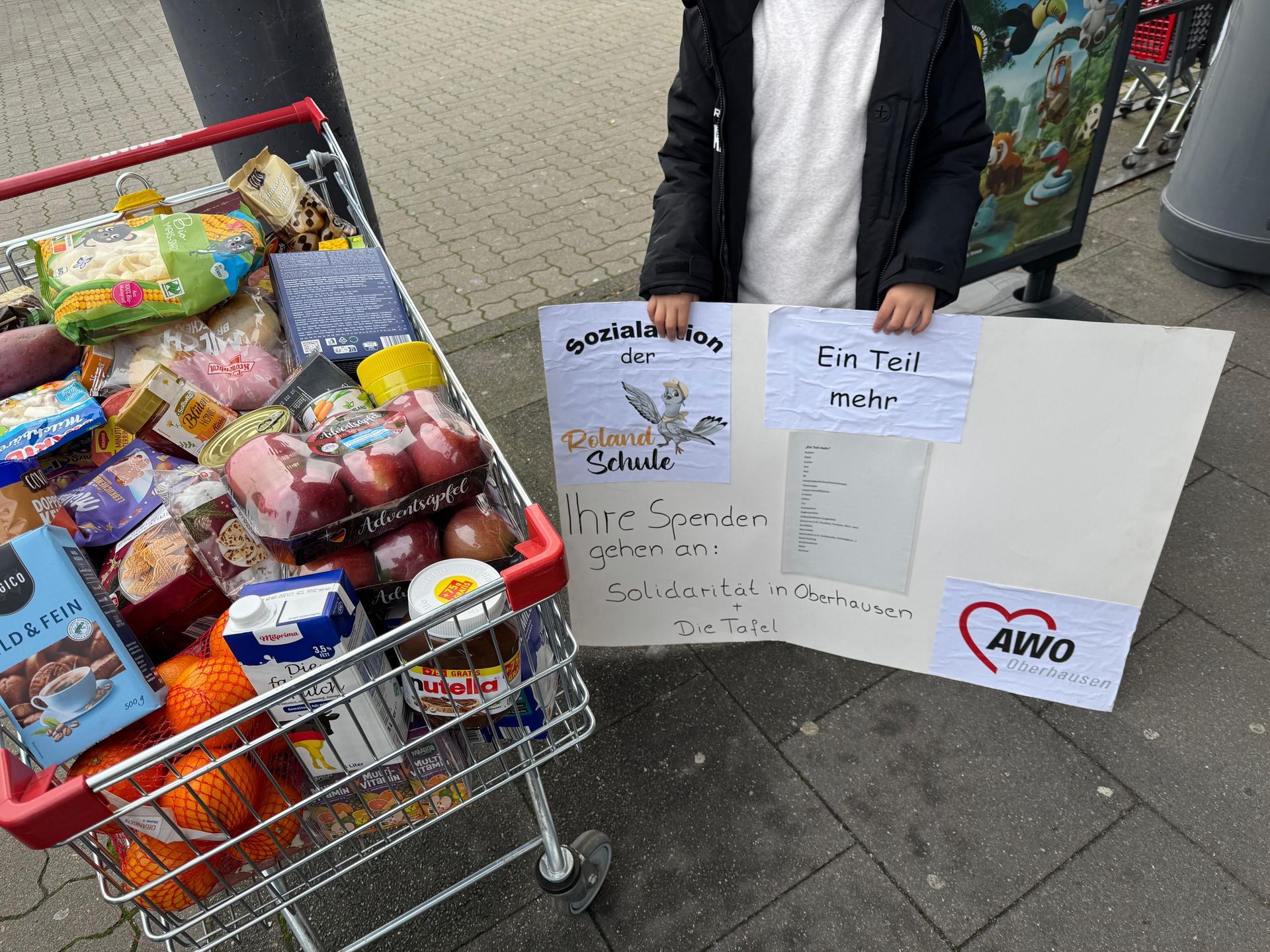 Am 05.12. führte das Schülerparlament unserer Schule wieder die Sozialaktion "Ein Teil mehr" durch. Vor 3 verschiedenen Supermärkten (Aldi, Rewe, Penny) standen die Kinder, unterstützt durch Mitarbeiter unserer Schule, und sprachen die Kundinnen und Kunden an und baten sie "Ein Teil mehr" zu kaufen und in unseren Wagen zu legen.