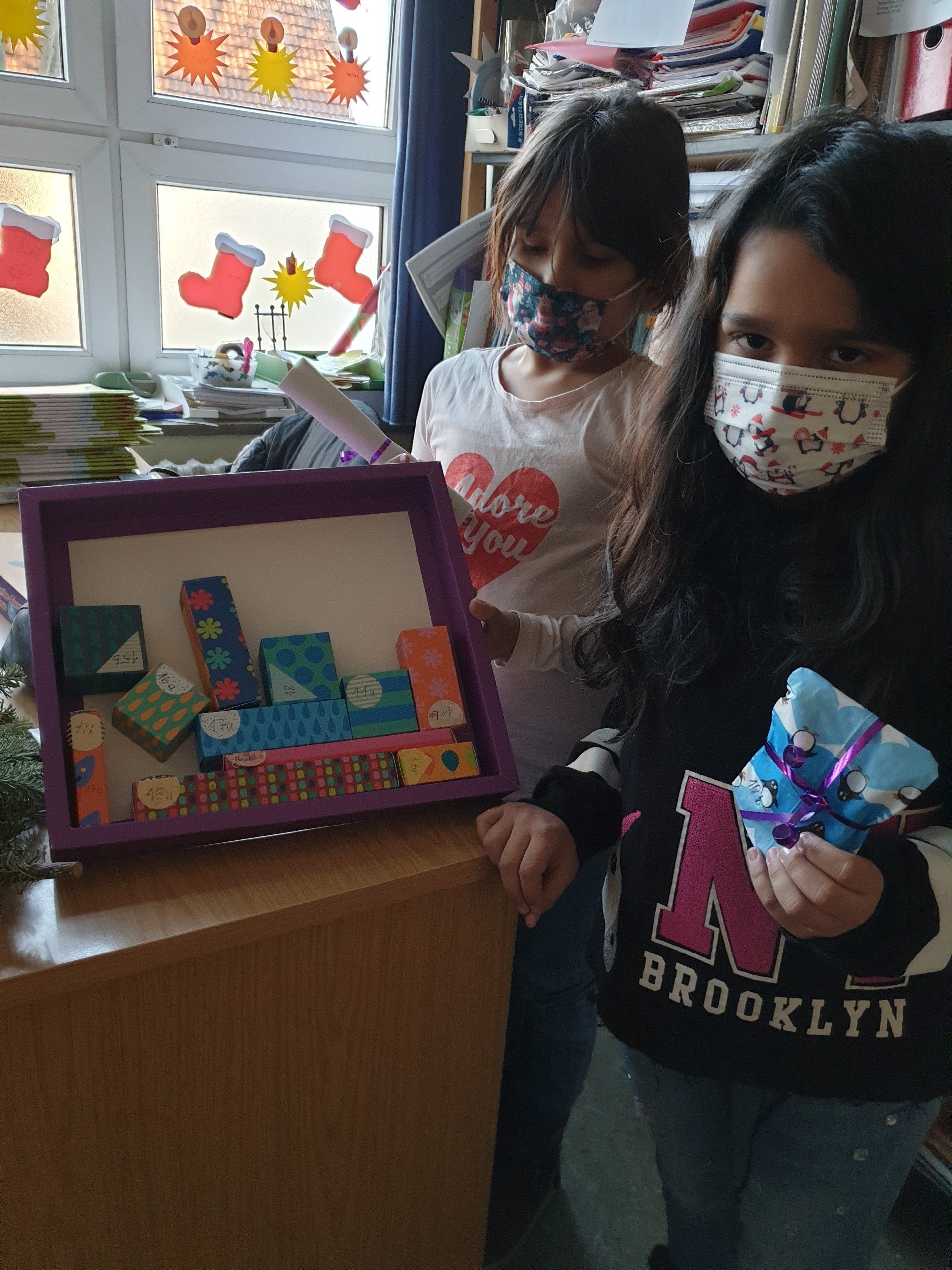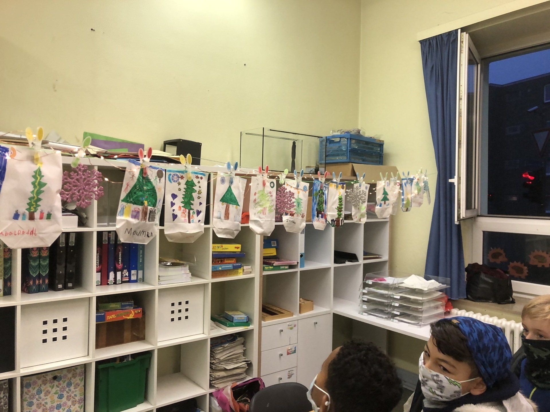 Wir haben einen tollen Adventskalender gestaltet. Wir haben auf Papiertütchen einen Weihnachtsbaum gemalt und unseren Namen drauf geschrieben. Frau Keller hat die Tütchen befüllt, Zahlen draufgeklebt, alle Tütchen auf eine Leine geheftet und eine Lichterkette drumherumgewickelt. Jeden Tag wurde eine Geschichte vorgelesen und zwei Kinder durften ihr Tütchen vom Adventskalender nehmen. Im Adventskalender gab es für jeden seinen persönlichen Glücksstein für das nächste Jahr und Schokolade.