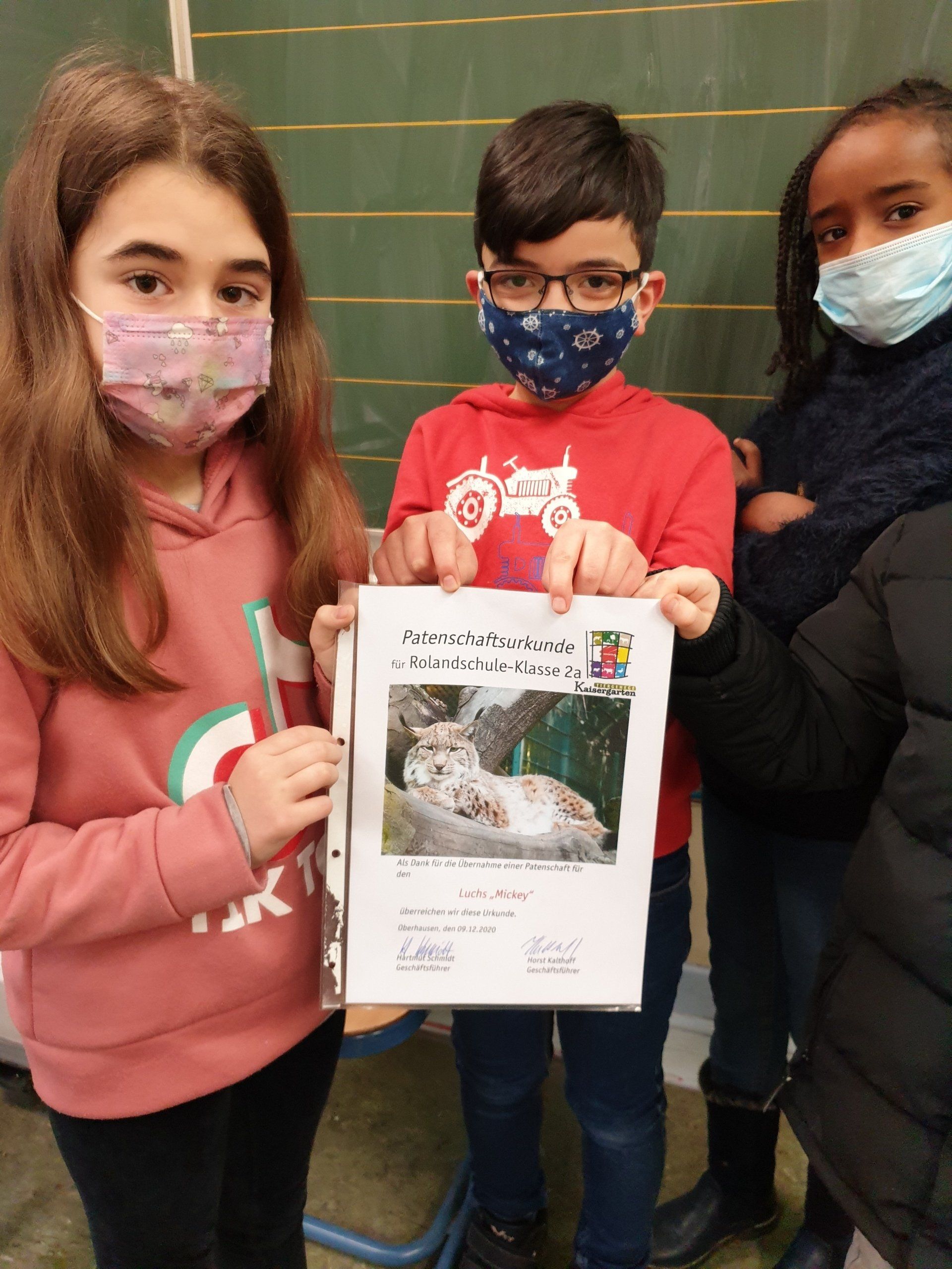 Der Schulverein sponsert in diesem Jahr jeder Klasse eine Patenschaft für ein Tier aus dem Tiergehege im Kaisergarten. Im November haben wir abgestimmt, welches Patentier wir haben möchten. Mehrheitlich wählten wir den Luchs Mickey.