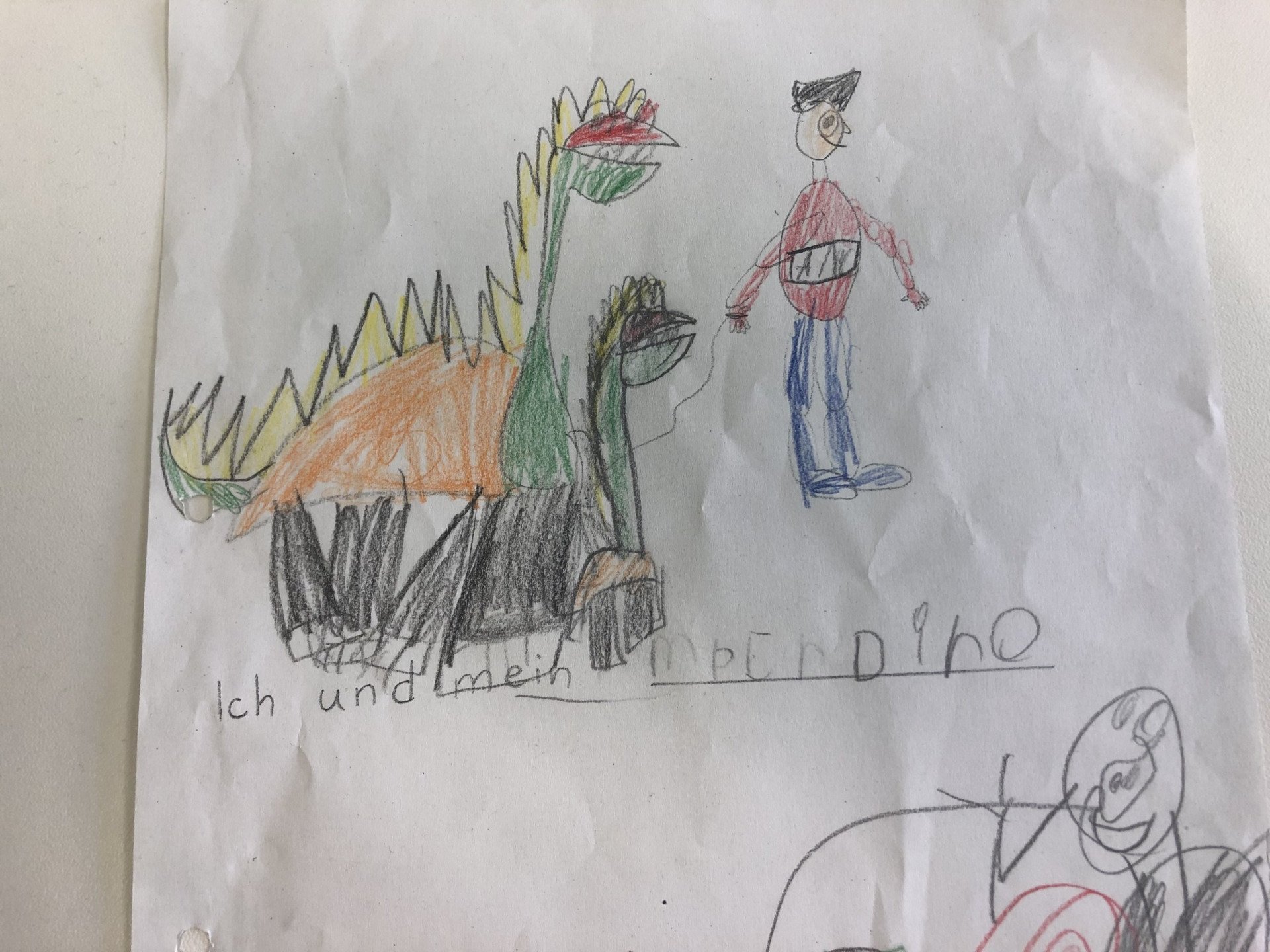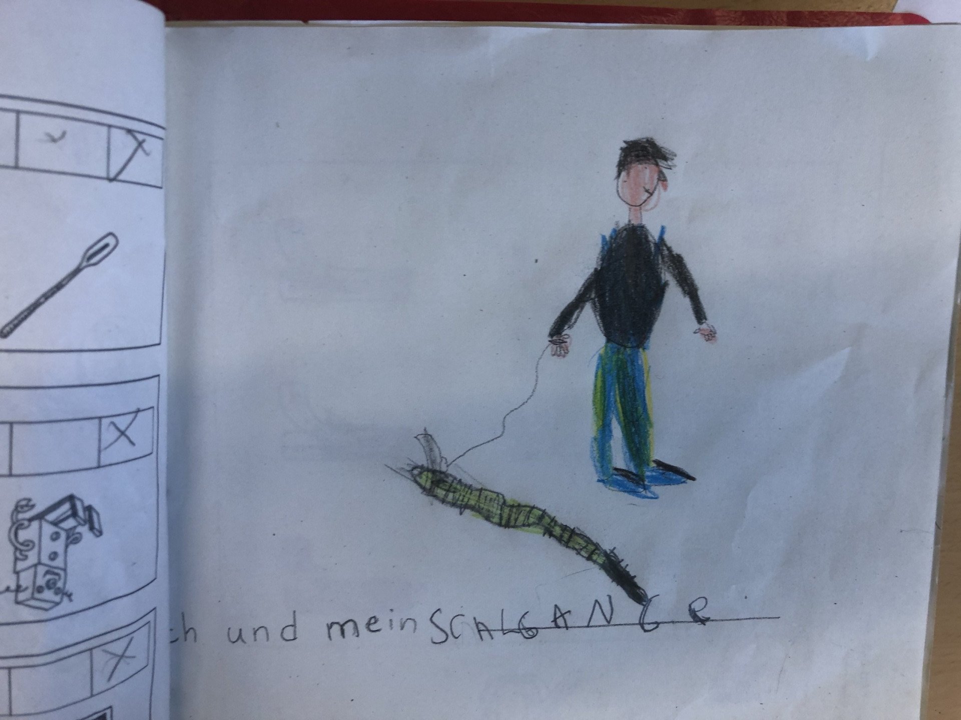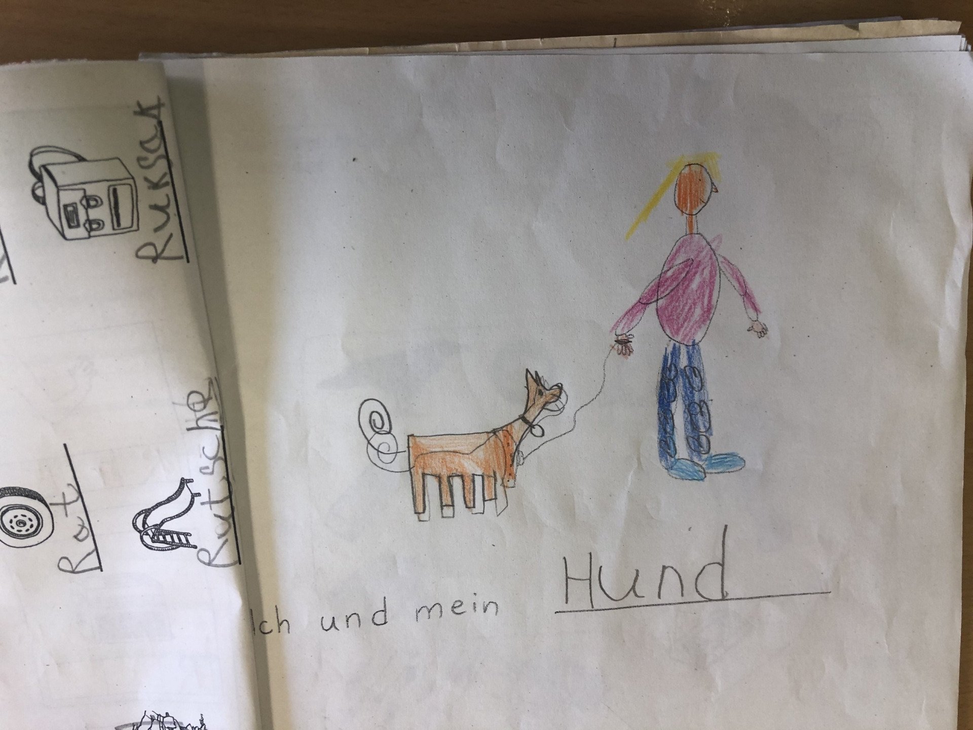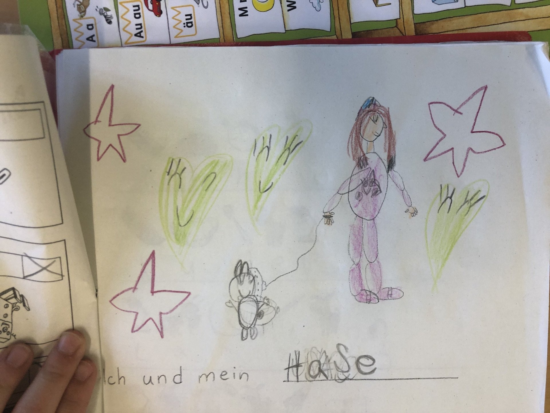 Frau Keller hat uns zum ersten Mal einen Schreibanlass bearbeiten lassen und das hat wunderbar funktioniert. Sie hat uns ein Bild mit einem Menschen mit einer Leine gezeigt. Wir durften uns dann ein Tier aussuchen, dass an der Leine geführt wird und es an die Leine malen. Dann sollten wir drunter schreiben, um was für ein Tier es sich handelt. Die Ergebnisse unserer Stunde sind wunderbar! Es gab Hasen, Dinos, Katzen, Eisbären, viele Hunde und noch viel mehr verschiedene Tiere an der Leine.