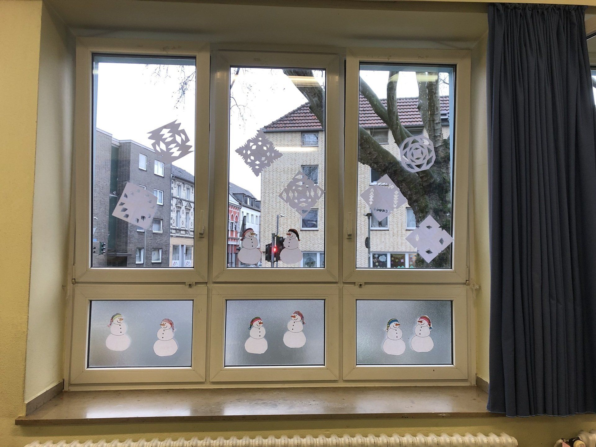 Wir haben in Kunst neue Fensterdekoration gebastelt. Es sind Schneemänner und Schneeflocken geworden. Wir haben bei den Schneeflocken einfach mal drauflos gefaltet und geschnitten. Die meisten Schneeflocken wurden super. Falls eine Flocke nicht gelungen war, konnte man sie nochmal zusammenfalten und mehr Löcher reinschneiden. Das hat uns so viel Spaß gemacht, dass wir am Ende etwa 100 Flocken hatten.