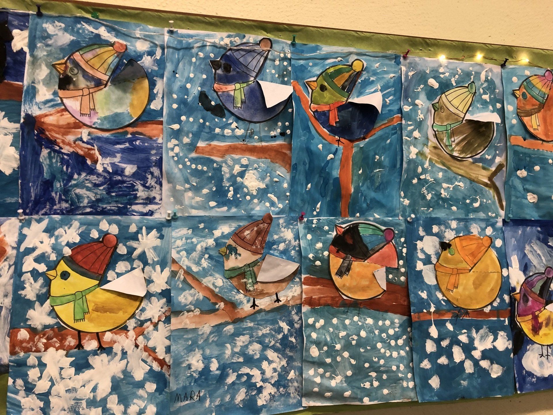 Wir haben Vögel im Schnee mit dem Farbkasten gestaltet. Dazu haben wir erst den blauen Hintergrund mit dem Ast gemalt. Als nächstes musste der Vogel bemalt und hinten die Schwanzfeder eingeschnitten und gefaltet werden. Schließlich wurde der Vogel auf den Hintergrund geklebt und alles mit Schnee (Deckweiß) betupft.
