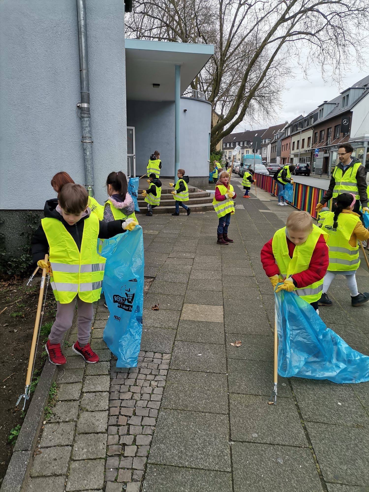 Am 20.03.2023 sammelten wir, ausgerüstet mit Warnwesten, Handschuhen, Greifzangen und Müllbeuteln in drei Gruppen Müll rund um unsere Schule. Neben Papier-und Plastikmüll, sehr vielen Zigarettenkippen und Blechdosen, fanden wir sogar ein Unterhemd und einen Einkaufswagen. Insgesamt füllten wir in zwei Stunden drei Müllsäcke. Das war ganz schön viel Müll.