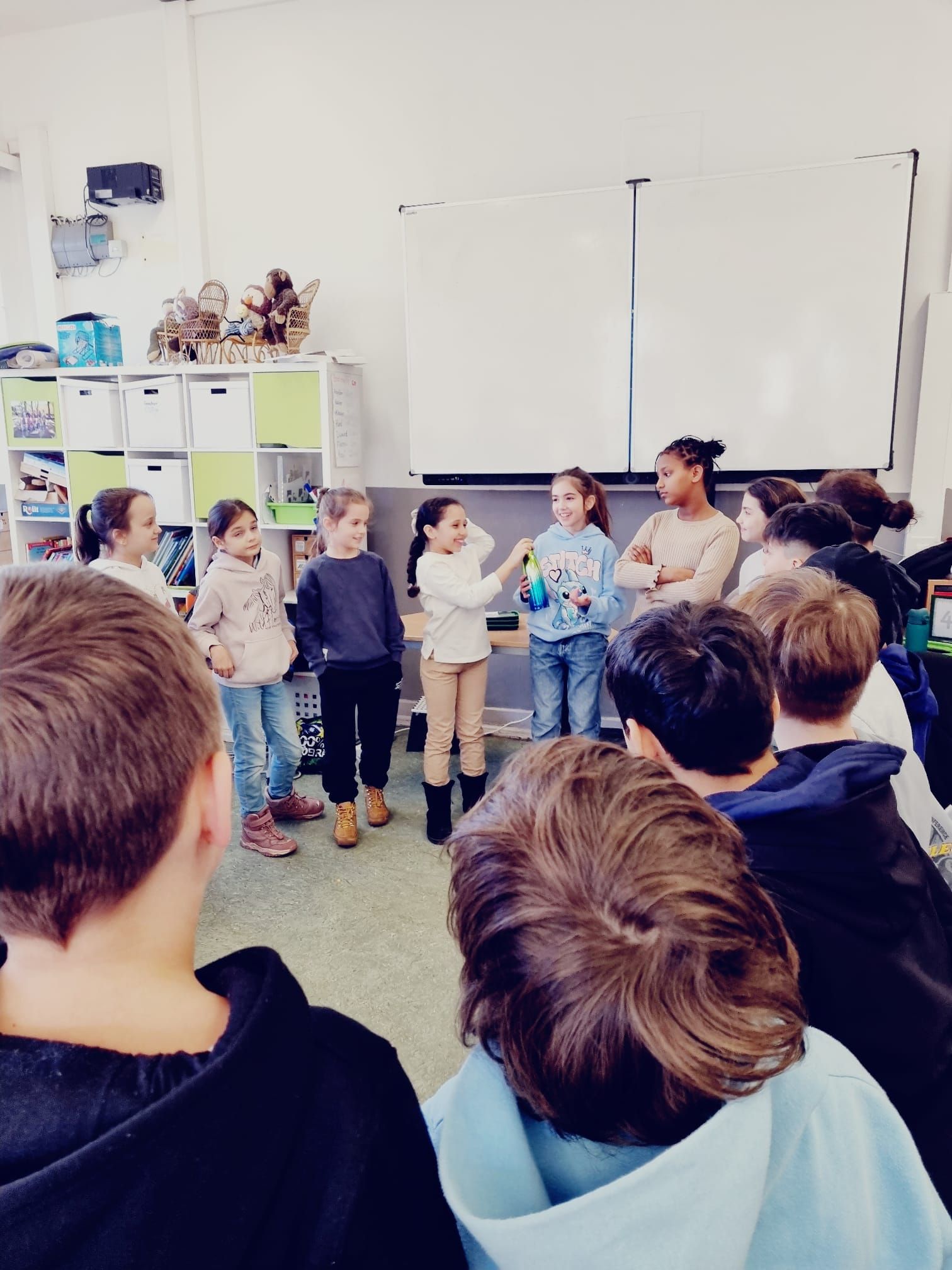 Danach stellten wir die Tische in unserer Klasse an die Seite und stellten uns zu einem großen Kreis auf. Wir versuchten einen „Klatschkreis“ als Aufwärmung zu erzeugen, bei dem jemand einmal klatscht und der Nachbar fortlaufend im Uhrzeigersinn auch einmal klatscht, bis das Klatschen beim ersten Kind wieder angekommen ist. Dabei muss man genau beobachten, wer gerade klatscht und wann man selbst klatschten muss. Das war gar nicht so einfach, vor allem wenn zwei Klatscher gleichzeitig unterwegs waren. Anschließend hatten wir die Gelegenheit, erste Theatererfahrungen zu sammeln und zu erfahren, was Spontantheater bedeutet und wofür Requisiten im Theater wichtig sind. Dies konnten wir direkt an einer Flasche ausprobieren, indem jeder von uns spontan einen anderen Gegenstand daraus erschuf und dazu spontan handelte. Beispielsweise wurde aus der Flasche ein Handy zum Telefonieren und ein Ball zum Fußball spielen.