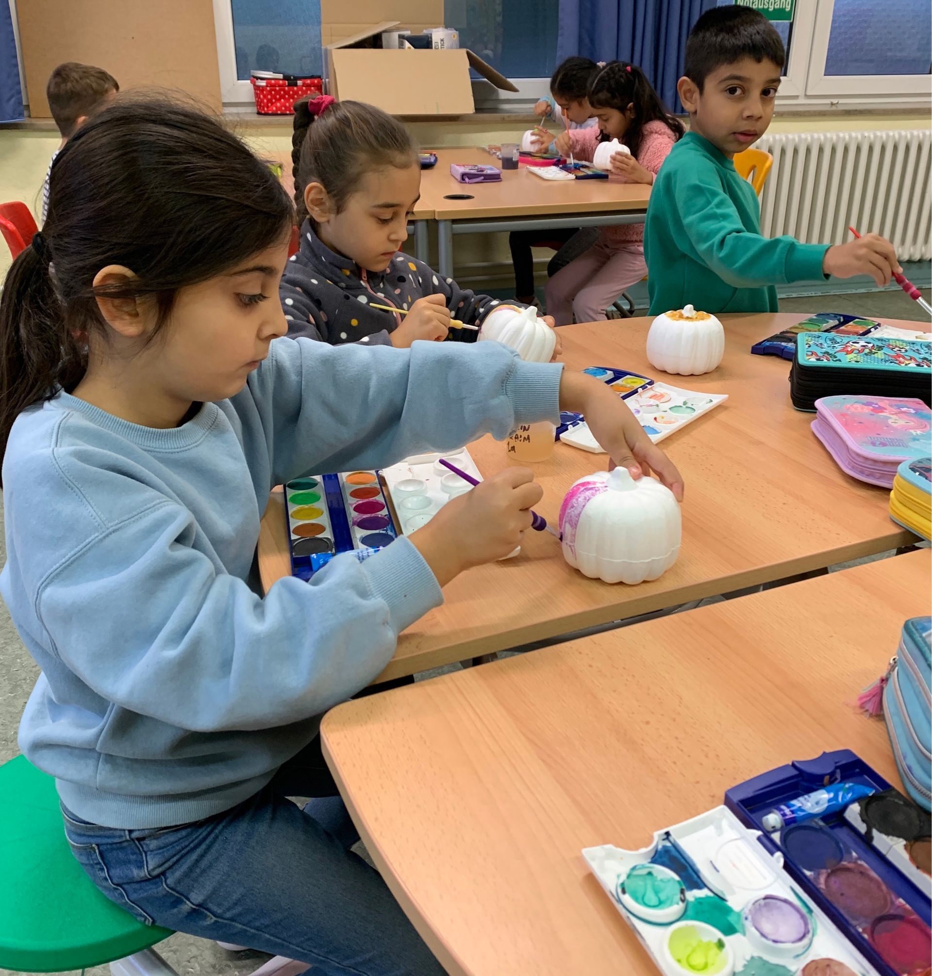 Herr Derin von der Süd-Apotheke hat uns Styroporkürbisse gesponsert. Im Kunstunterricht bemalten wir sie mit Wasserfarben. Wir haben uns dabei sehr viel Mühe gegeben. Die bemalten Kürbisse gaben wir anschließend in der Apotheke ab. Damit wird das Schaufenster zu Halloween dekoriert.