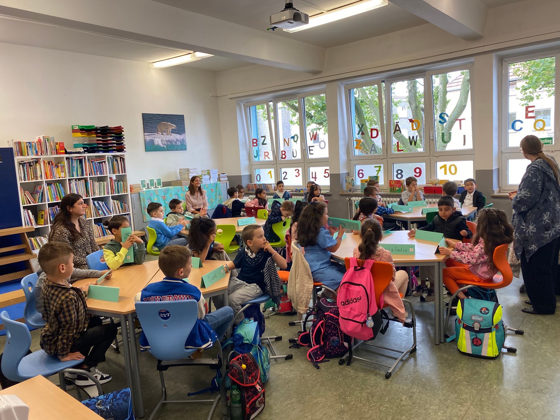 Erst haben wir uns zu einem Gottesdienst in der Kirche getroffen. Eisbär Nanouk, unser Klassentier, Igel Ingo, das Klassentier der 1b und Taube Roland waren auch dort. Auf dem Schulhof haben die Kinder der anderen Klassen eine kleine Aufführung für uns vorbereitet. Anschließend hatten wir unsere 1. Schulstunde als Schulkind. Ein Kind hatte an diesem Tag sogar Geburtstag.