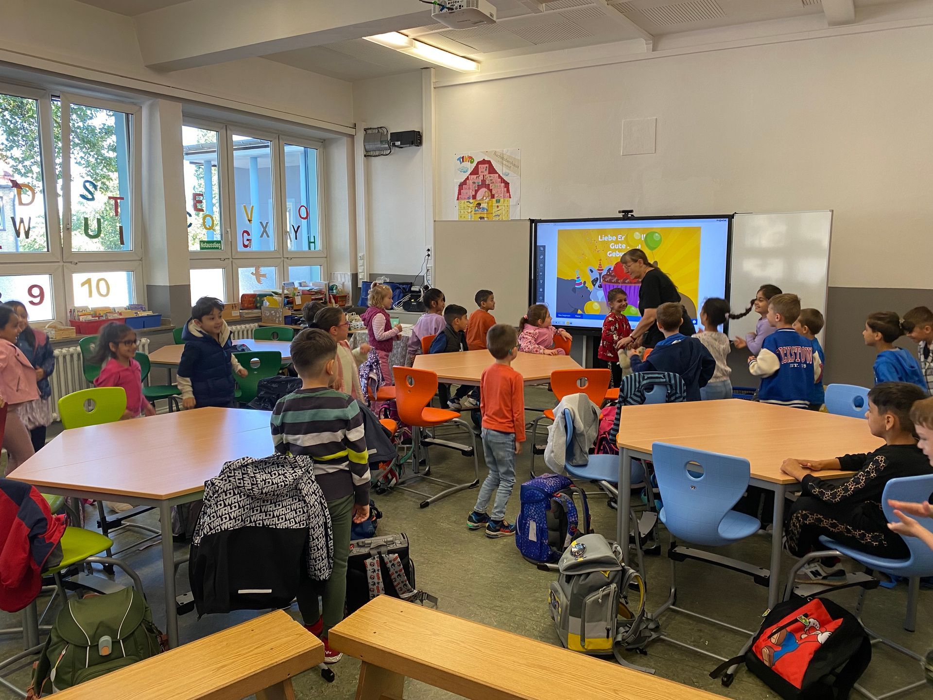 Auf der digitalen Tafel gab es eine Geburtstagstorte zu sehen und ein Geburtstagslied zu hören.