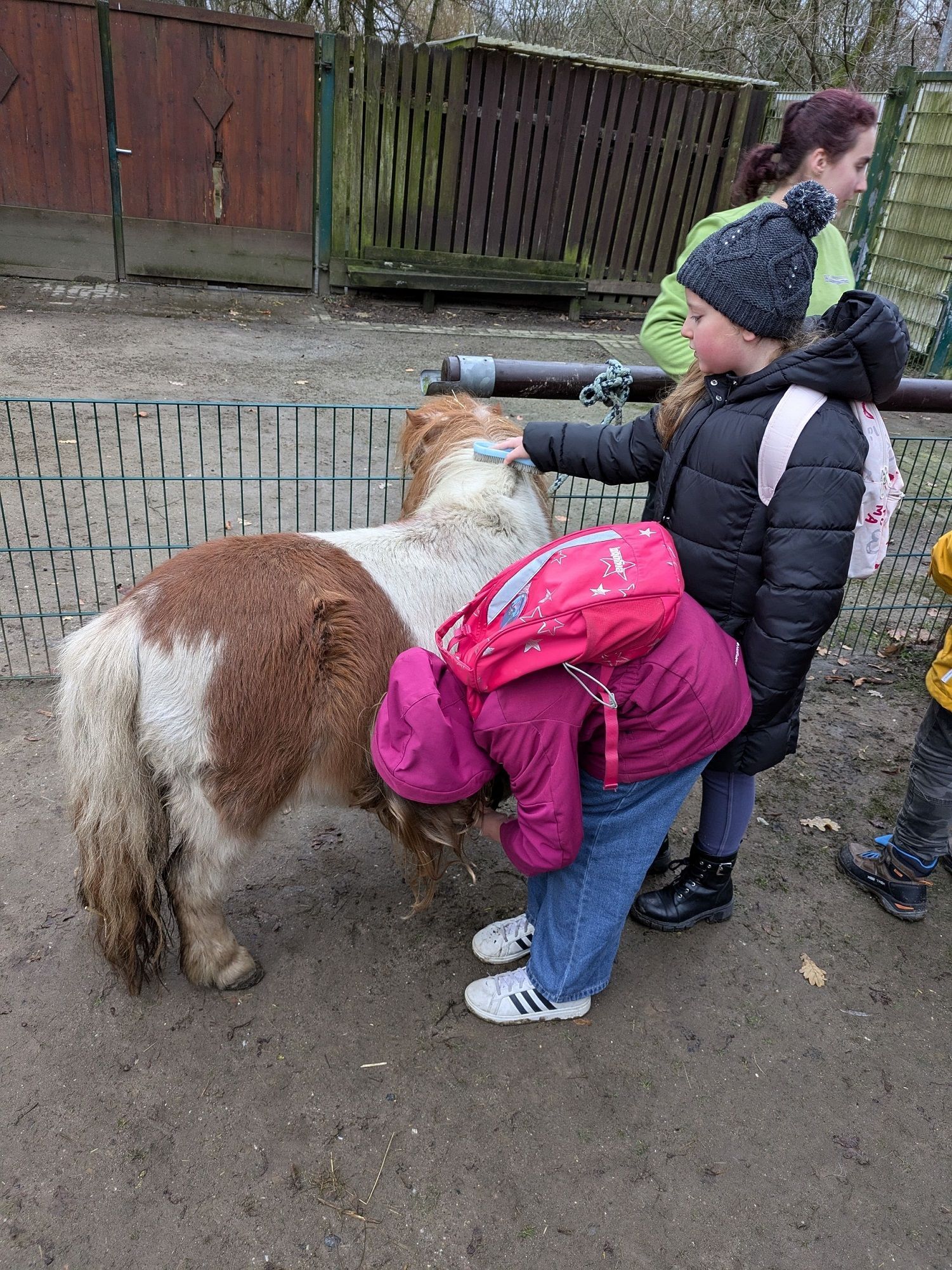 Vor Ort sind wir zunächst auf den Spielplatz gegangen und haben dort ein wenig gespielt. Danach ging es weiter mit einer spannenden Führung, bei der wir viel über die Tiere und die Umgebung gelernt haben. Besonders schön war es, als wir endlich Fiffy sehen konnten! Wir durften unser Patentier striegeln, was uns allen großen Spaß gemacht hat. Auch das Außengelände haben wir gemeinsam sauber gemacht – jeder war sehr engagiert dabei und wollte helfen.