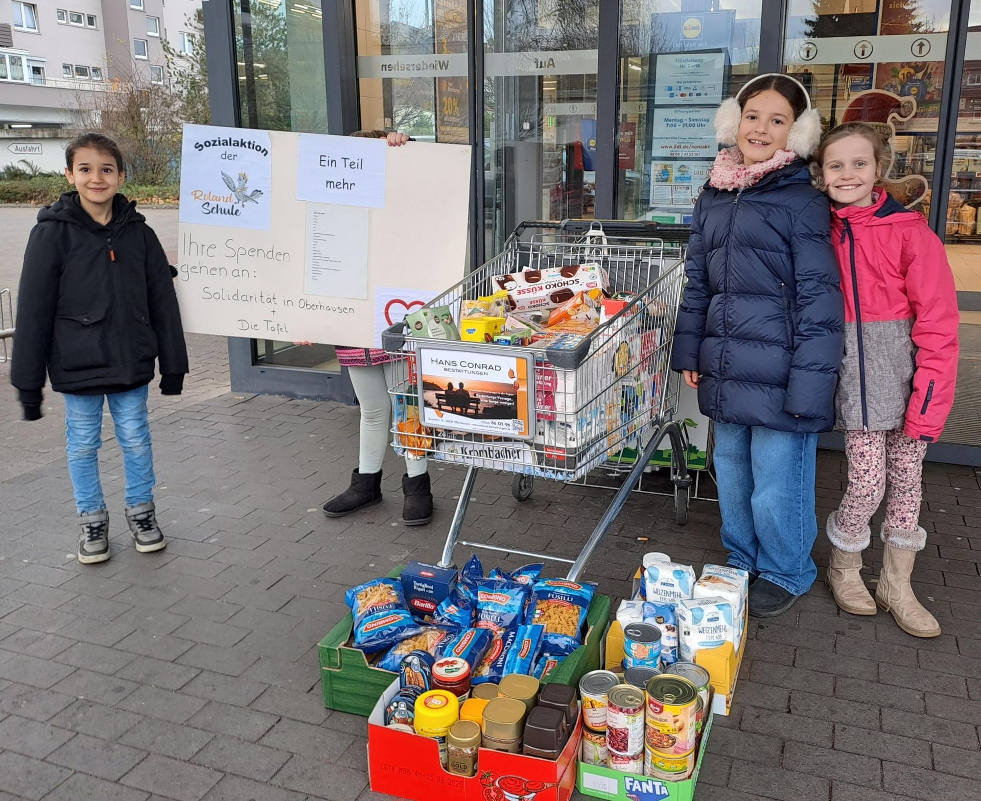 Am 05.12. führte das Schülerparlament unserer Schule wieder die Sozialaktion "Ein Teil mehr" durch. Vor 3 verschiedenen Supermärkten (Aldi, Rewe, Penny) standen die Kinder, unterstützt durch Mitarbeiter unserer Schule, und sprachen die Kundinnen und Kunden an und baten sie "Ein Teil mehr" zu kaufen und in unseren Wagen zu legen.
