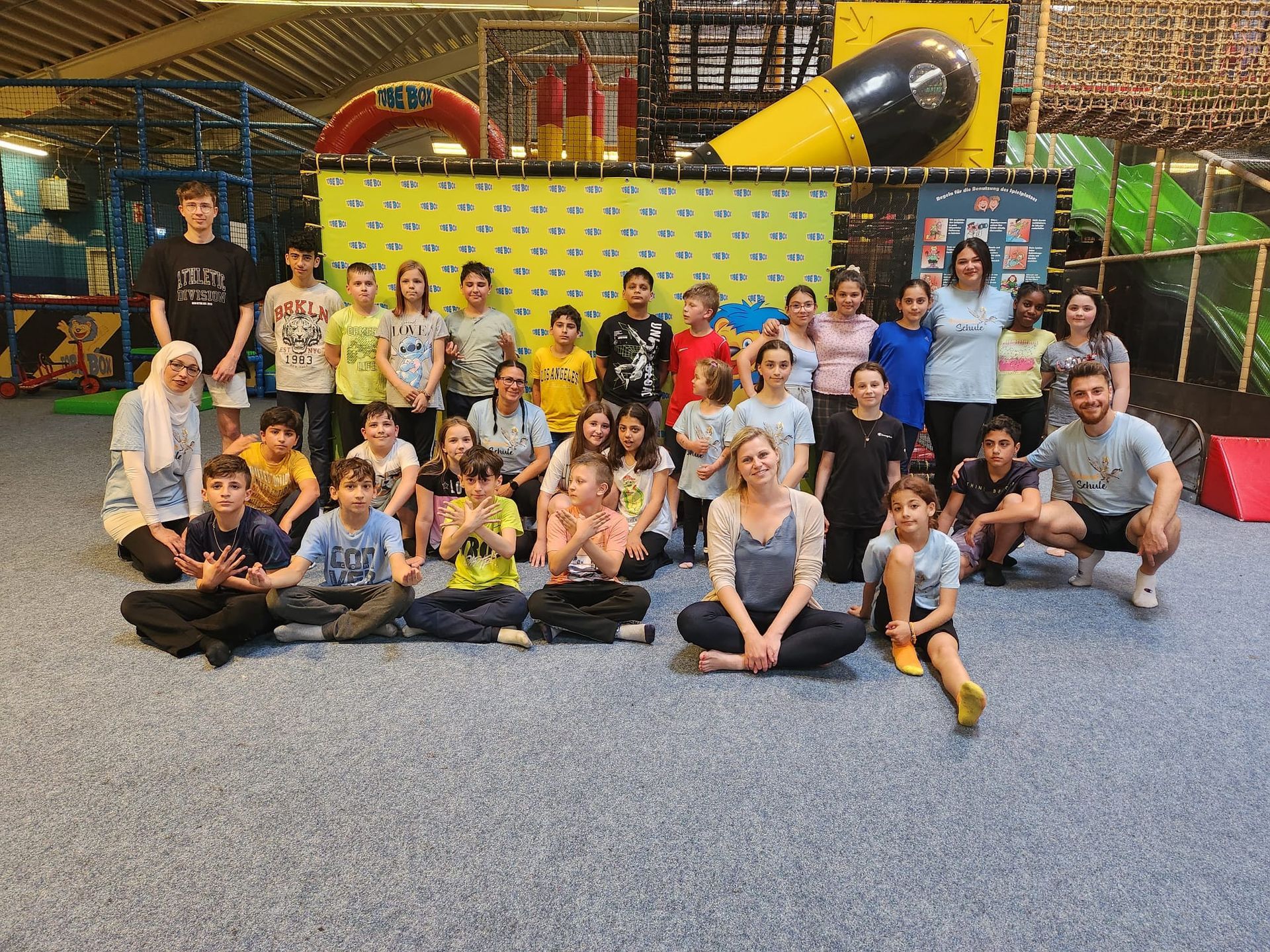 Aber auch ohne Wasser gab es genug zu entdecken und zum Spielen. Hüpfberge, Tretkarts, Teppichrutschen, Heuballen, Streichelzoo und vieles mehr. Mittags konnten sich alle bei Pommes und Getränken stärken. Um 16 Uhr fuhren die Busse wieder ab. Um 17.30 Uhr kamen alle glücklich, aber müde gespielt an der Schule an.
