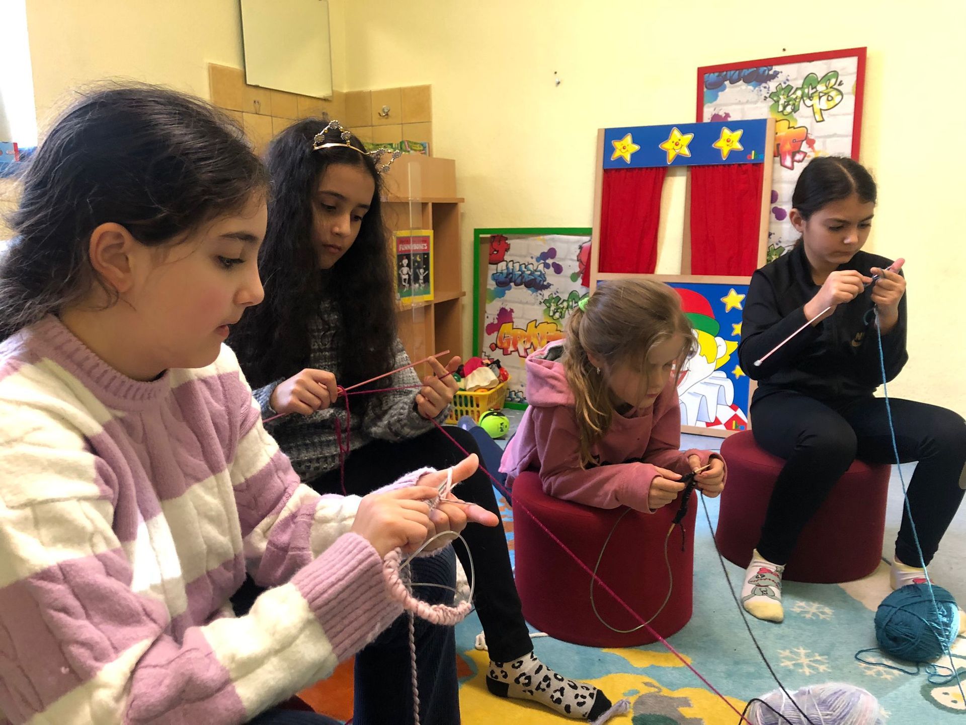 Frau Logisch strickt mit den Kindern im Kunstraum.