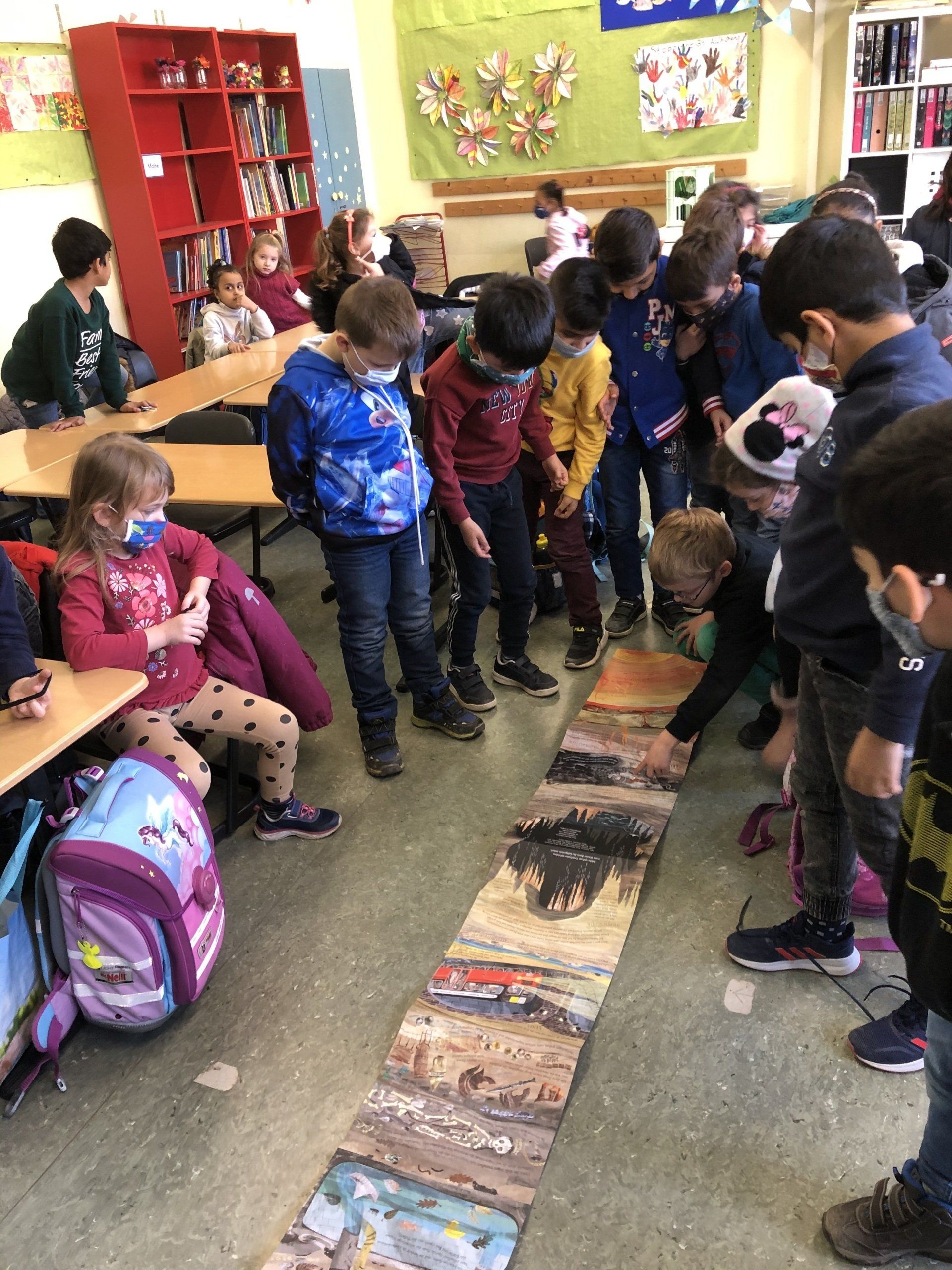 Am internationalen Vorlesetag hat Frau Römer uns „Das kleine Gespenst“ vorgelesen. Das war schön und lustig. Am Montag danach hat Frau Keller mit uns noch ein super spannendes Buch gelesen. Es heißt „Unter unseren Füßen“ und lässt sich 1,5m weit nach unten ausklappen. Man kann dort sehen, was alles unter unseren Füßen ist. Da sind zum Beispiel Abwasserrohre, U-Bahn-Schächte und man kann sogar den flüssigen Erdkern sehen. Auf der Rückseite kann man das Buch wieder zurückklappen und man reist wieder an die Erdoberfläche zurück. Dort erfährt man etwas über die unterschiedlichen Erdschichten, Gesteinsschichten, Mineralien, Pflanzen/Wurzeln und welche Tiere so im Boden leben. Das war wirklich spannend und wir hatten viel zu schauen und wussten auch schon ganz viel, was wir dazu erzählen konnten.
