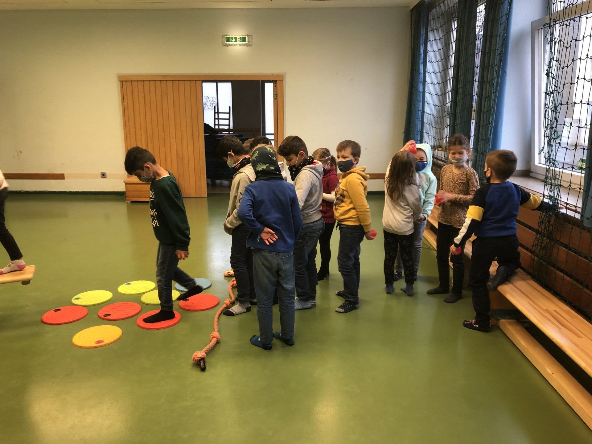 Herr Spellerberg macht mit uns weiter das Drachentraining. Wir haben einiges über Gefühle gelernt und wie man sie aus dem Gesicht ablesen kann. Das ist gar nicht so einfach mit Masken auf... Wir haben das in der Gymnastikhalle auch geübt und haben dort noch einen tollen Hindernislauf absolviert. Diesen kann man nur als ganze Klasse gewinnen, wenn alle zusammenhalten, alle ganz langsam laufen, einige helfen (nicht alle, sonst gibt es zu viel Gedrängel) und wenn alle aufeinander Rücksicht nehmen.
