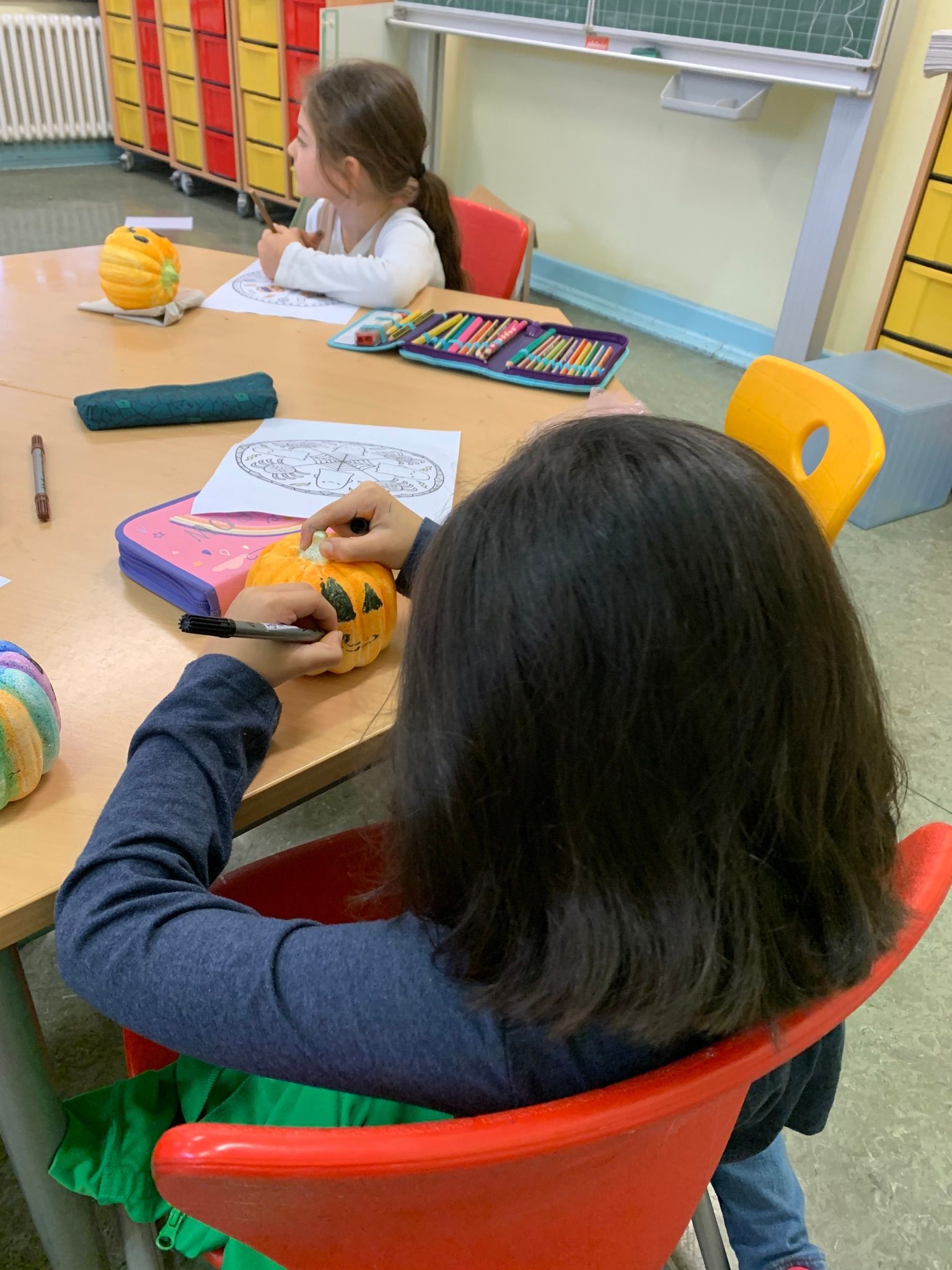 Herr Derin von der Süd-Apotheke hat uns Styroporkürbisse gesponsert. Im Kunstunterricht bemalten wir sie mit Wasserfarben. Wir haben uns dabei sehr viel Mühe gegeben. Die bemalten Kürbisse gaben wir anschließend in der Apotheke ab. Damit wird das Schaufenster zu Halloween dekoriert.