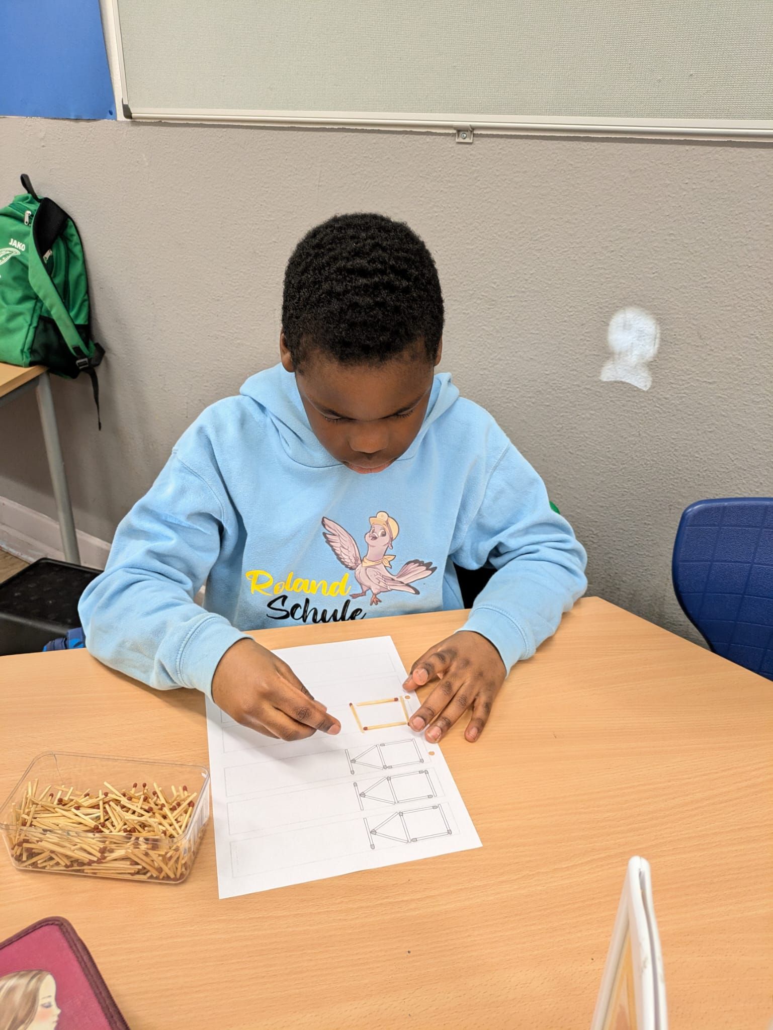 Besonders fasziniert waren die Kinder von der Arbeit mit Streichhölzern, aus denen sie unterschiedliche Muster legten, sowie von den Knobeleien am Geobrett, wo logisches Denken und räumliches Vorstellungsvermögen gefragt waren. Kunst und Naturwissenschaften wurden verbunden, als die Klasse einen Vogel künstlerisch gestaltete, der später zu einem lückenlosen Muster zusammen gelegt werden konnte.