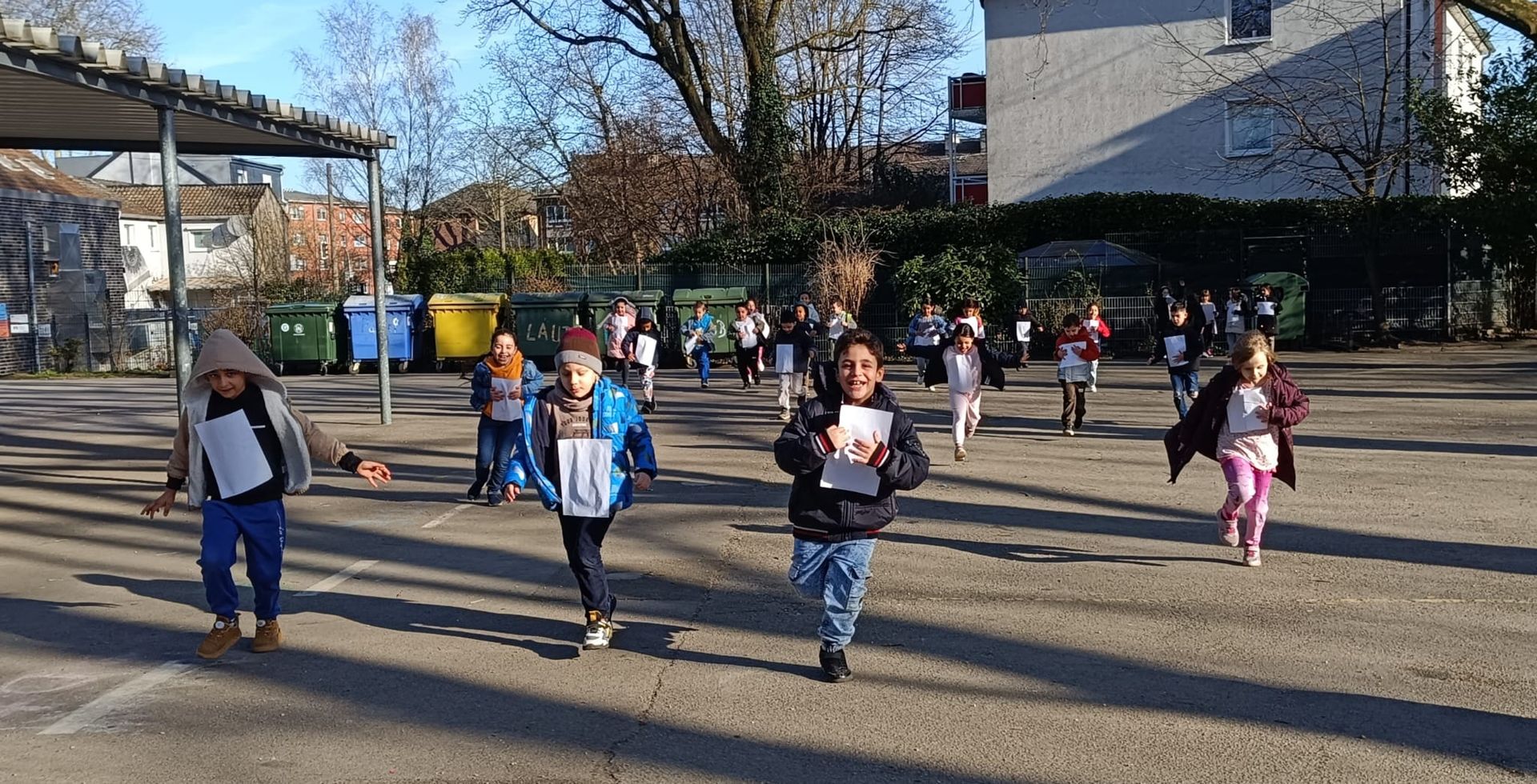 Anschließend sind wir auf den Schulhof gegangen. Dort sind die Kinder mit einem Blatt Papier vor dem Körper schnell gerannt. Dabei haben sie herausgefunden, dass das Papier am Körper bleibt. Danach sind die Kinder mit Regenschirmen gerannt. Wir haben erkannt, dass Luft auch bremsen kann.