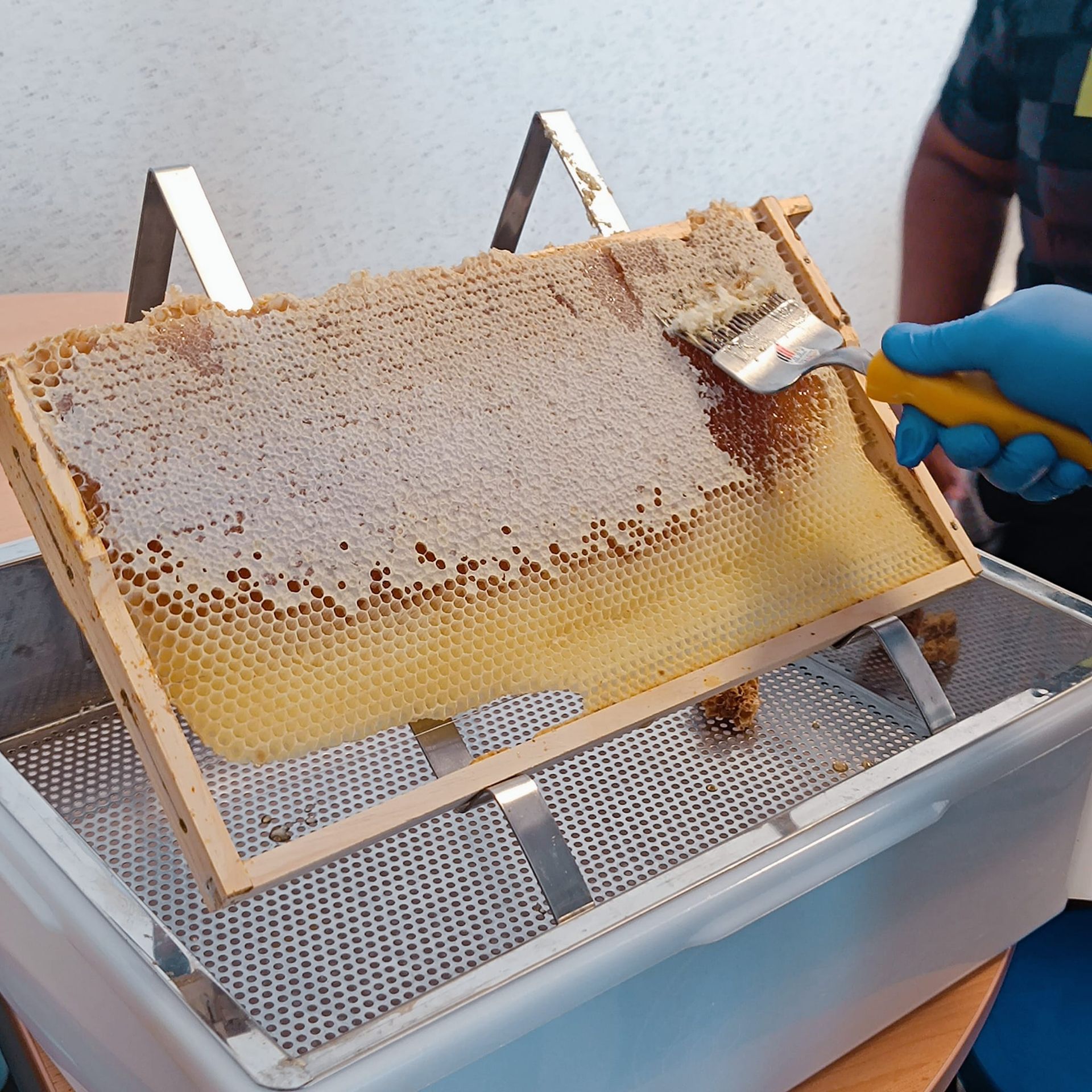 Bevor der Honig in die Schleuder kam, durften wir sogar zuschauen, wie eine Honigwabe vorbereitet wurde. Die dünne Wachsschicht auf der Wabe wurde vorsichtig abgekratzt.