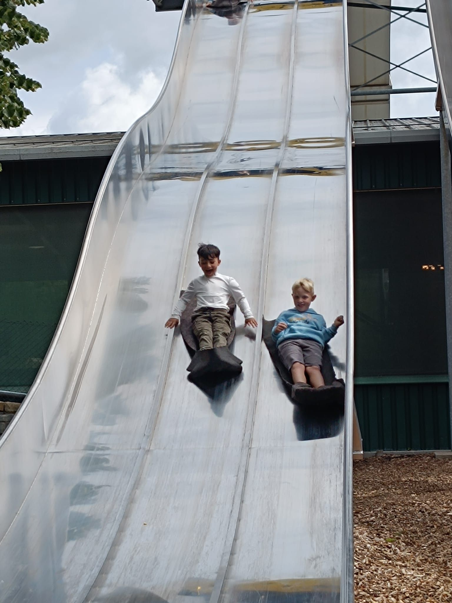 Dann ging es los: Wir sind zu den vielen Rutschen gelaufen. Es gab große, kleine und schnelle Rutschen – und wir hatten riesigen Spaß dabei!